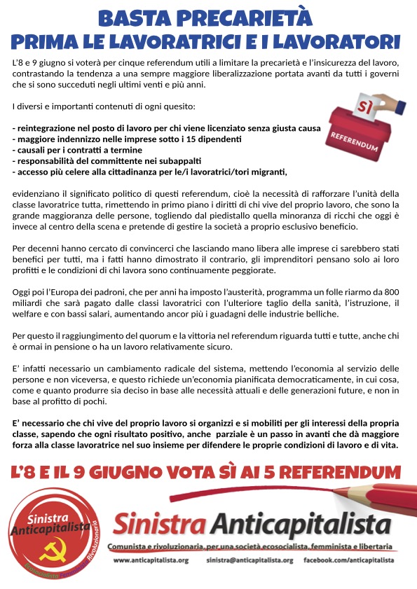 Pubblichiamo qui di seguito il volantino che da qualche settimana le compagne e i compagni di Sinistra Anticapitalista stanno distribuendo nel quadro della campagna di sostegno ai referendum su quali le cittadine e i cittadini italiane/i saranno chiamati a pronunciarsi i prossimi 8 e 9 giugno. (Red)
