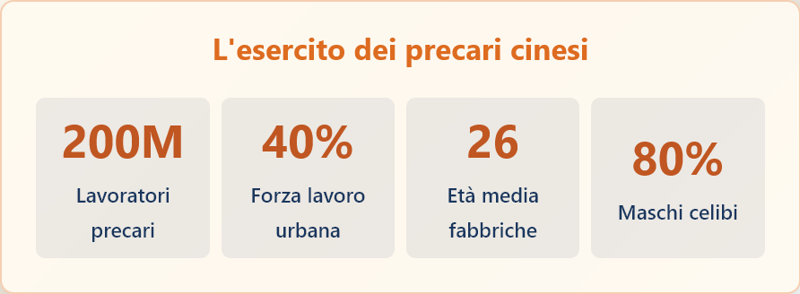 L’economia cinese ha generato un esercito di lavoratori precari di proporzioni senza precedenti. Duecento milioni di persone, il 40 circa della forza lavoro urbana del paese e un quarto circa di quella totale, vivono oggi in condizioni di impiego flessibile, scrive l’Economist. Questa massa di lavoratori precari rappresenta la spina dorsale invisibile dell’economia cinese, eppure rimane largamente esclusa dalle tutele e dai diritti che il sistema garantisce formalmente ai dipendenti regolari. La loro condizione è ormai diventata strutturale.