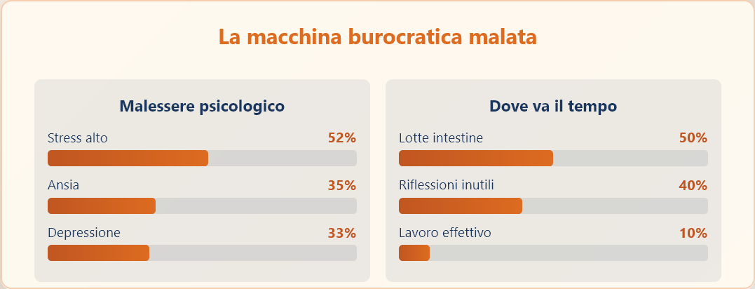 Chen Lu, funzionaria di livello intermedio, calcola che solo il 10% delle energie viene dedicato al lavoro effettivo, principalmente scrivere documenti, il 40% si disperde in riflessioni sul valore e il significato di ciò che si fa e ben il 50% viene assorbito dalle lotte intestine. Il risultato è una burocrazia paralizzata. Molti funzionari sono ormai capaci solo di gridare slogan e scrivere manifesti, le loro condizioni fisiche e soprattutto mentali impediscono loro di condurre ricerche concrete o prendere decisioni. Xu Ming racconta che il suo ente copia apertamente i risultati di altre unità. Una volta, dopo aver revisionato un documento troppo astruso oltre venti volte, il suo dirigente ha fatto copiare direttamente il testo da produrre da quello di un distretto periferico di Pechino, nonostante le caratteristiche delle due entità amministrative fossero completamente diverse. Lei stessa ha finito per capire la logica: tanto nessuno leggerà davvero quei documenti, perché rischiare facendo il lavoro autonomamente? Il risultato complessivo è quello di una burocrazia paralizzata, capace solo di produrre slogan e documenti, priva ormai delle competenze necessarie per condurre ricerche concrete o prendere decisioni.
