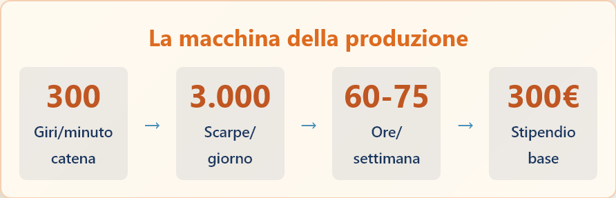 I ritmi di lavoro sono pianificati deliberatamente in modo da mettere a prova i limiti della resistenza umana. La velocità della catena di montaggio eccede le capacità di una persona, tanto che se qualcuno riesce a tenere il passo viene considerato un eroe. I lavoratori cercano di adattarsi gradualmente a questi ritmi impossibili, sforzandosi di non creare problemi nella propria fase per paura di rallentare l’intera linea. Il controllo è così rigido che quando un operaio ha tentato segretamente di rallentare l’indicatore regolabile, la direzione ha reagito con furia. La lunghezza delle piste crea ulteriori difficoltà, con il rischio costante che le scarpe si accavallino una sull’altra durante il processo.