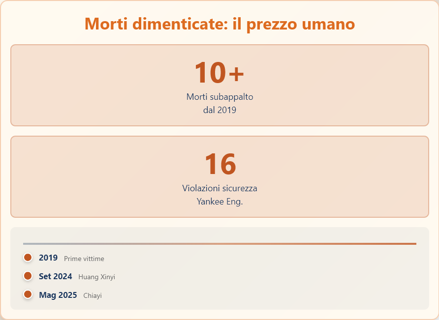 Huang Xinyi non è un caso isolato. L’Associazione per gli infortuni sul lavoro taiwanese ha documentato almeno dieci morti tra i lavoratori in subappalto presso cantieri TSMC dal 2019. Il 26 maggio 2025 un altro operatore è morto in uno stabilimento in costruzione a Chiayi, di nuovo per un appalto gestito da Yankee Engineering. Secondo il sistema di consultazione del ministero del Lavoro, Yankee Engineering ha accumulato almeno sedici infrazioni alla legge sulla sicurezza occupazionale tra il 2017 e maggio 2025, incluse mancate prevenzioni di cadute e crolli, nonché un’inadeguata gestione contrattuale. L’azienda, quotata in borsa e con contratti per la costruzione di impianti TSMC in tutto Taiwan, continua a ricevere appalti nonostante questo curriculum.