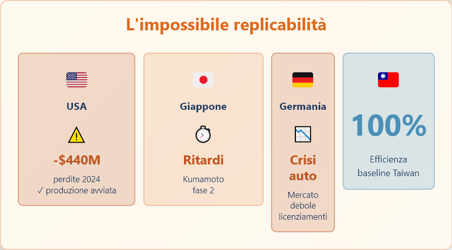 La difficoltà di TSMC nel riprodurre il proprio modello operativo fuori da Taiwan emerge con particolare chiarezza nell’esperienza americana. Quando l’azienda ha annunciato nel 2020 la costruzione del primo impianto in Arizona, la narrazione prevalente descriveva l’iniziativa come un trionfo della cooperazione tecnologica transatlantica. La realtà sul campo si è rivelata molto più complessa. Gli impianti di Phoenix hanno iniziato la produzione di massa nel 2025, raggiungendo la redditività operativa, ma il percorso è stato segnato da ritardi, costi imprevisti e tensioni culturali profonde. Un tecnico taiwanese intervistato da Initium Media nel cantiere di Phoenix ha sintetizzato il problema in termini diretti. “Si tratta di una questione di natura umana. La velocità americana è quella che è, e i taiwanesi pensano che basti essere un po’ più veloci di loro. Ricevi lo stesso stipendio, ma l’efficienza degli altri è solo il 50% della tua. Continueresti a impegnarti al 100%?” La frustrazione non riguarda semplicemente differenze superficiali di ritmo lavorativo. Riflette invece uno scontro tra sistemi produttivi costruiti su presupposti incompatibili riguardo al rapporto tra lavoro e vita personale, tra flessibilità e regolamentazione, tra improvvisazione e proceduralizzazione.