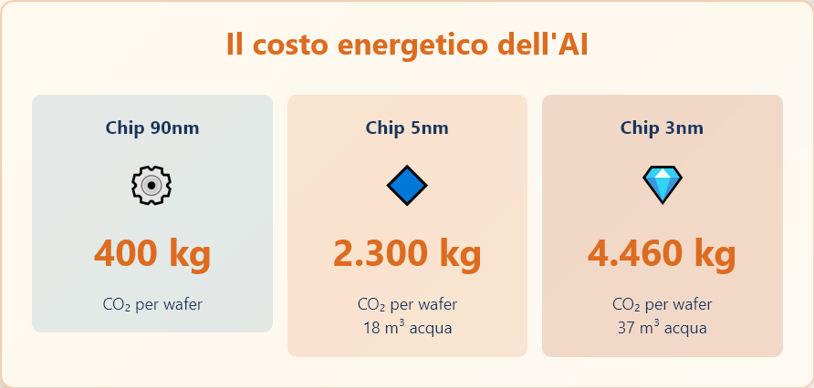 Questa rinascita tecnologica ha però un prezzo materiale che raramente compare nelle narrazioni trionfalistiche sull’intelligenza artificiale. Produrre un singolo wafer di silicio a 3 nanometri genera emissioni equivalenti a 4.460 chilogrammi di anidride carbonica e consuma 37,2 metri cubi d’acqua, quasi il doppio rispetto al processo a 5 nanometri e oltre dieci volte di più rispetto ai chip a 90 nanometri usati per applicazioni meno avanzate. Il consumo energetico medio per completare uno strato di circuito su un wafer da dodici pollici è passato da 21,4 kilowattora nel 2017 a 40,5 kilowattora nel 2023. Nel complesso, TSMC ha consumato da sola 25,3 miliardi di kilowattora nel 2024, pari all’8,9% dell’intera elettricità taiwanese. L’industria dei semiconduttori nel suo insieme ha assorbito il 14,2% del consumo nazionale. Queste cifre sono destinate a crescere vertiginosamente. Taiwan Power Company, l’azienda elettrica statale, prevede che entro il 2030 l’industria dei semiconduttori richiederà altri 28,4 miliardi di kilowattora, un aumento del 75% rispetto al 2023.