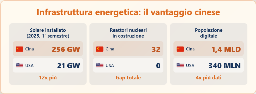 La Cina gode tuttavia di alcuni vantaggi strutturali che potrebbero rivelarsi decisivi nel lungo periodo. Il paese dispone di una base di ingegneri altamente qualificati, molti dei quali formati nelle migliori università cinesi come Tsinghua, Pechino e Zhejiang, e che si muovono fluidamente tra laboratori nella Silicon Valley e progetti in patria. La politica anti-immigrazione dell’amministrazione Trump e la xenofobia crescente del movimento MAGA potrebbero spingere più talenti a rientrare in Cina, portando competenze critiche. Sul fronte energetico, gli Stati Uniti si trovano alle prese con infrastrutture inadeguate e un dibattito politico che frena l’espansione delle rinnovabili. La Cina, invece, ha installato nella prima metà del 2025 ben 256 gigawatt di capacità solare, dodici volte i 21 gigawatt americani. Ha inoltre 32 reattori nucleari in costruzione contro nessuno negli Stati Uniti. Il paese dispone poi di 1,4 miliardi di abitanti con un’alta penetrazione digitale, generando volumi di dati che rappresentano un terreno ideale per addestrare sistemi di intelligenza artificiale applicati alla vita reale.