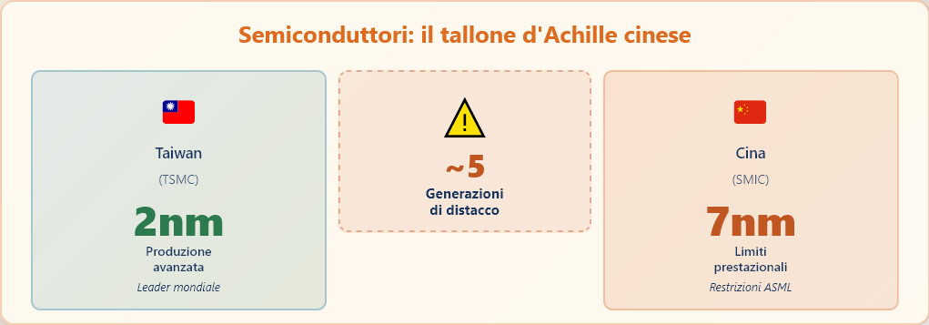 Il settore dei semiconduttori mette però a nudo la complessità e le vulnerabilità della situazione cinese. Le restrizioni americane sulle esportazioni di chip avanzati hanno spinto Pechino verso l’autosufficienza. Tuttavia, la realtà è più sfumata di quanto le dichiarazioni ufficiali lascino intendere. DeepSeek ha dovuto posticipare il lancio della sua nuova intelligenza artificiale, inizialmente previsto per maggio, a causa delle difficoltà nell’addestrarla con processori Huawei come richiesto dal governo. L’azienda aveva in realtà accumulato scorte consistenti di processori Nvidia di fascia alta prima dell’inasprimento delle restrizioni americane. Alibaba, da parte sua, ha potuto addestrare i propri modelli connettendosi a server installati fuori dal territorio cinese. Il congelamento degli asset della controllata cinese Nexperia da parte del governo olandese, giustificato con ragioni di sicurezza nazionale, ha ulteriormente evidenziato quanto la catena di approvvigionamento cinese dei semiconduttori rimanga vulnerabile alle pressioni geopolitiche. La finezza di incisione dei chip rimane il tallone d’Achille. Mentre Taiwan Semiconductor Manufacturing Company produce già chip a 3 nanometri e si prepara ai 2 nanometri, il gigante statale cinese SMIC è in grado di produrre chip solo fino ai 7 nanometri e dalle prestazioni più instabili rispetto alla concorrenza, un divario tecnologico che riflette le restrizioni occidentali sull’accesso alle macchine di litografia più avanzate prodotte dall’olandese ASML. Huawei starebbe tentando di costruire una propria linea di produzione basata su tecnologie emergenti per aggirare questi limiti, ma il successo è tutt’altro che garantito.