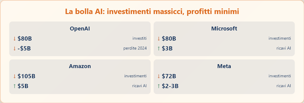 Nessuna delle aziende che sviluppano modelli di intelligenza artificiale generativa sta realizzando profitti. OpenAI, valutata 500 miliardi di dollari e considerata il campione del settore con 700 milioni di utenti per ChatGPT, ha perso 5 miliardi nel 2024 e si stima perderà tra i 14 e i 15 miliardi nel 2025. Microsoft, colosso tecnologico che genera decine di miliardi di utili ogni trimestre, prevede di incassare solo 3 miliardi dai servizi AI a fronte di investimenti pianificati per 80 miliardi quest’anno. Amazon spenderà 105 miliardi per ricavarne appena 5, mentre Google investirà 75 miliardi per guadagnarne 7,7. Meta, dopo il fallimento spettacolare del “metaverso”, ha puntato tutto sull’AI con una spesa di 72 miliardi che dovrebbe fruttare tra i 2 e i 3 miliardi. Il costo elevato dei centri di calcolo fa perdere denaro persino sugli abbonamenti a pagamento. L’unica società che sta davvero guadagnando in questa corsa è Nvidia, produttrice delle unità di elaborazione grafica che alimentano l’addestramento dei modelli AI, il cui valore di mercato ha appena raggiunto i 5 trilioni di dollari.