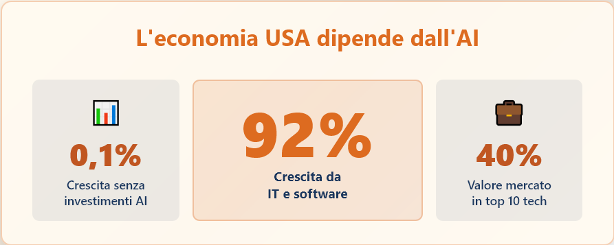 Nel primo semestre di quest’anno, l’economia degli Stati Uniti ha registrato una crescita del prodotto interno lordo che ha fatto parlare di una tenuta e di un dinamismo superiori rispetto alla Cina. Sotto la superficie di questi numeri rassicuranti si nasconde tuttavia una realtà ben diversa. Gli investimenti in apparecchiature informatiche e software hanno generato il 92% della crescita economica statunitense durante tale periodo. Senza questa componente, concentrata principalmente nell’intelligenza artificiale, la crescita si sarebbe fermata a un misero 0,1% annualizzato. Parallelamente, le dieci maggiori società tecnologiche, guidate dalle cosiddette Magnifiche Sette dell’AI, rappresentano ormai il 40% del valore totale del mercato azionario del paese. L’economia americana dipende oggi in modo preponderante da una scommessa colossale sull’intelligenza artificiale, una corsa agli investimenti che ricorda le grandi bolle speculative del passato. Questa fragilità strutturale non riguarda solo Wall Street o la Silicon Valley, ma anche gli equilibri della competizione tecnologica con la Cina, rivelando come entrambe le superpotenze stiano costruendo la propria narrativa di forza economica su fondamenta più precarie di quanto ammettano pubblicamente.