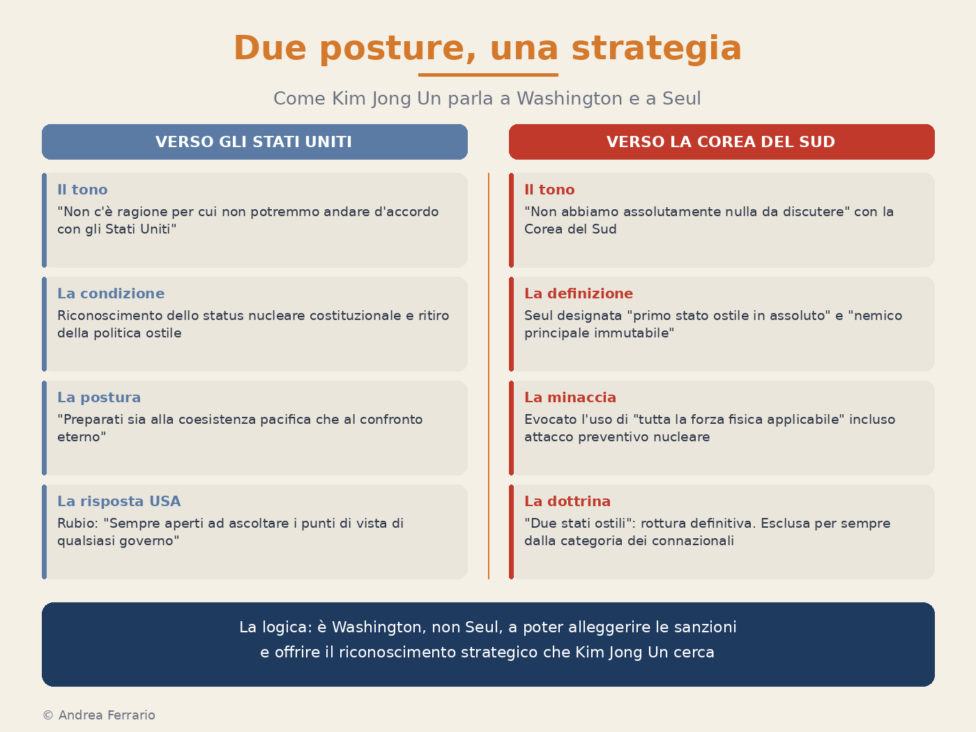 Poche ore dopo la pubblicazione delle dichiarazioni congressuali, il segretario di stato Marco Rubio ha affermato che gli Stati Uniti sono «sempre aperti ad ascoltare» i punti di vista di qualsiasi governo, citando esplicitamente la Corea del Nord. Il viaggio di Trump in Cina previsto tra la fine di marzo e l’inizio di aprile aveva alimentato le speculazioni su un possibile contatto tra i due leader in quella cornice. Ma quattro giorni dopo la chiusura del congresso l’operazione militare congiunta di Stati Uniti e Israele contro l’Iran ha ucciso la guida suprema Khamenei, alterando radicalmente il contesto di tali dichiarazioni. Per Pyongyang l’evento ha confermato nel modo più drammatico possibile la necessità della deterrenza nucleare. Dopo la cattura di Maduro in Venezuela a gennaio, Khamenei è il secondo leader considerato dal regime nordcoreano parte del fronte anti-imperialista a essere eliminato, e ciò in appena due mesi. La condanna ufficiale nordcoreana ha definito l’operazione una dimostrazione della «natura egemonica e gangsteristica» degli Stati Uniti, un linguaggio che va nella direzione opposta rispetto al «non c’è ragione per non andare d’accordo» del congresso. La frase del rapporto congressuale secondo cui «i nostri nemici non sanno cosa stiamo pianificando e calcolando, e non devono saperlo» acquista alla luce degli eventi iraniani una risonanza ben diversa.