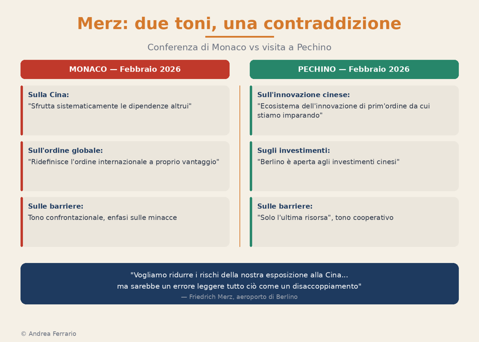 Il tono del cancelliere a Pechino è stato sensibilmente diverso da quello esibito poche settimane prima alla Conferenza sulla sicurezza di Monaco, durante la quale aveva accusato la Cina di “sfruttare sistematicamente le dipendenze altrui” e di “ridefinire l’ordine internazionale a proprio vantaggio”. Nella capitale cinese, queste lamentele sono state sostituite da una retorica all’insegna della cooperazione. Merz ha parlato di un “ecosistema dell’innovazione di prim’ordine” dal quale la Germania sta imparando, ha dichiarato che Berlino è aperta agli investimenti cinesi e ha ribadito che le barriere commerciali restano per lui solo l’ultima risorsa. Al tempo stesso, ha sollevato il tema dello squilibrio commerciale, delle sovvenzioni statali cinesi, del tasso di cambio artificialmente basso dello yuan e delle restrizioni alle esportazioni di terre rare, chiedendo ai suoi interlocutori “la riduzione dei sussidi che distorcono il mercato” e “un consolidamento laddove si riscontrano sovraccapacità”. Durante la cena con Xi, ha discusso dell’ordine cinese di 120 aerei Airbus, ha anticipato ulteriori contratti in via di definizione e ha annunciato che fisserà presto una data per la ripresa delle consultazioni intergovernative, sospese dalla pandemia. Nel comunicato congiunto, entrambe le parti si sono limitate a “prendere nota” delle preoccupazioni dell’altra, formula diplomatica che registra le divergenze senza risolverle.