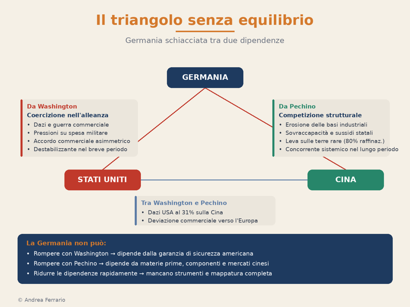 Il rischio per la Germania, e per l’Europa intera, è quello di negoziare da una posizione di debolezza con entrambi i vertici del triangolo. Berlino non può permettersi di rompere con Washington perché dipende dalla garanzia di sicurezza americana, per quanto essa sia diventata inaffidabile. Non può permettersi di rompere con Pechino perché le sue industrie dipendono da materie prime, componenti e mercati cinesi. E non dispone ancora degli strumenti per ridurre queste dipendenze in tempi rapidi. La strategia di sicurezza economica nazionale promessa per il 2025 non è stata completata e non esiste un meccanismo di controllo sugli investimenti in uscita. Inoltre, la mappatura delle dipendenze nelle catene di fornitura non è ancora stata portata a compimento.
