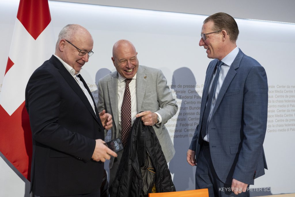 16 marzo 2026, «tutti insieme»: se la ridono Pierre-Yves Maillard dell’Unione sindacale svizzera, Fabio Regazzi dell’Unione svizzera delle arti e mestieri e Adrian Wuethrich di Travail.Suisse.